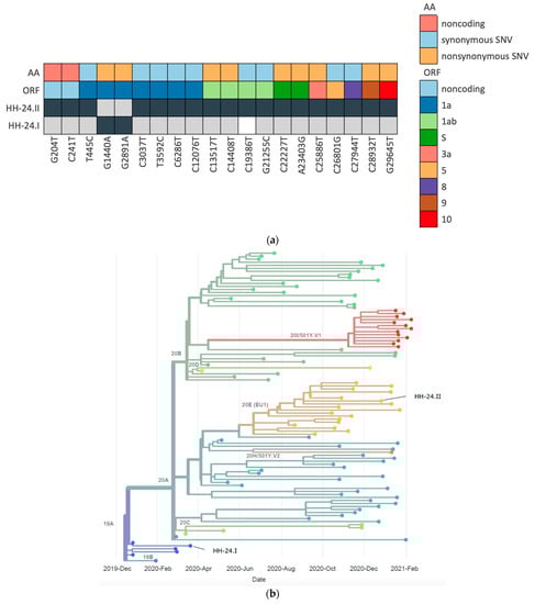 Next generation sequencing (NGS) revealed that the viral sequences from the initial virus variant in March (HH-24.I) and the variant in December (HH-24.II) belonged to pangoline lineages B.3 and B.1.177, respectively [] (Figure 3b). In total, both sequences differ in 21 positions (Supplementary Materials Table S3 and Figure 3a), including two typical variations in spike proteins A222V and D614G.