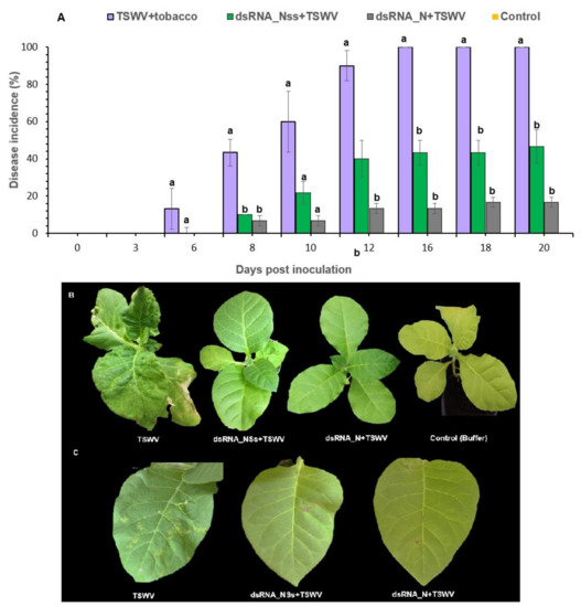 In order to test the efficacy of the dsRNA molecules in suppressing TSWV infection, ten N. tabacum plants were used for each of the following treatments: (a) TSWV plus dsRNA_N, (b) TSWV plus dsRNA_NSs, (c) TSWV (positive control), and (d) inoculation buffer (negative control). At the sap dilution of 5 × 102, TSWV-inoculated plants (positive control to ensure that the TSWV inoculum is infectious), exhibited systemic vein clearing and chlorotic lesions and necrosis at six dpi in inoculated leaves, and all plants exhibited severe mosaic symptoms at 12 dpi (Figure 2B). Symptom development was monitored in all treatments until 20 dpi. From the three experiments performed, based on symptom appearance and subsequent progression, 84% of the plants in the dsRNA_N + TSWV treatment had no visible symptoms, whereas 54% of dsRNA_NSs + TSWV-treated plants did not develop any symptoms (Figure 2A). Both treatments protected tobacco plants from TSWV infection, compared to 100% of the plants that were inoculated with TSWV only became symptomatic. Plants that received dsRNAs topically (either dsRNA_N and dsRNA_NSs) exhibited a delay in symptom expression since no symptoms were observed at six dpi, whereas at the same time point, 13% of TSWV-inoculated plants exhibited severe TSWV disease symptoms (Figure 2A,B).