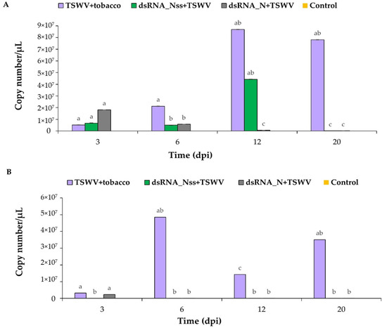 Accumulation of tomato spotted wilt virus (TSWV) in inoculated and younger, non-inoculated leaves of tobacco at different time points. Logarithmic graph of the viral copy numbers of four different treatments (dsRNA_N + TSWV, dsRNA_NSs + TSWV, TSWV+ tobacco, and control. (A) TSWV copy number in co-inoculated leaves and (B) TSWV copy number in younger, non-inoculated leaves. Different letters indicate statistically significant differences (p < 0.05) between means. Error bars represent standard error.