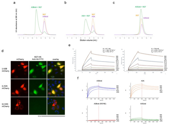 scFv 5G7 binds A3Bctd and A3A but not A3Gctd. (a–c) Size-exclusion chromatography profiles showing the co-elution of A3Bctd (a) and A3A (b) with scFv 5G7 as stable binary complexes. In contrast, A3Gctd (c) and scFv 5G7 eluted as independent peaks (overlapping due to their similar sizes). (d) Immunofluorescence to detect A3B in HeLa cells transiently transfected with (i) A3Ai-Cherry, (ii) A3Bi-Cherry, or (iii) A3Gi-Cherry. (e) SPR sensorgrams showing the interaction of A3Bctd with immobilized scFv 5G7. Two independent experiments were performed with the association time of 120 and 300 s and the dissociation time of 300 and 750 s, respectively. The equilibrium dissociation constant (KD) was determined by fitting the kinetic data to a 1:1 binding model (colored lines show the best fit). (f) Biolayer interferometry (BLI) sensorgrams showing the interaction of A3Bctd, A3A, A3Gctd, and A3Bctd (R374E) to immobilized scFv 5G7. Because the observed kinetics did not follow a 1:1 binding model very well, KD values were not determined.