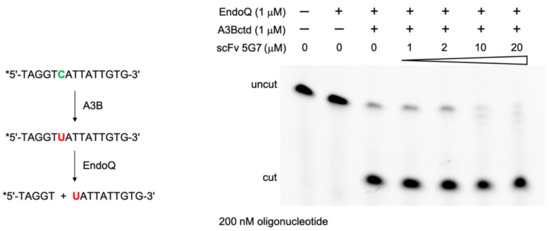 We then tested whether the 5G7 scFv inhibits the DNA deaminase activity of A3Bctd using our recently developed EndoQ-mediated oligonucleotide cleavage assay [20]. The activity of 1.0 μM A3Bctd was not inhibited even in the presence of 20-fold molar excess of the 5G7 scFv (Figure 2), suggesting that this antibody does not bind to or interfere with the active site of A3Bctd. This observation is consistent with the reactivity of the 5G7 scFv to both A3Bctd and A3A as described above, because these two highly homologous proteins differ most significantly in the “loop 1” region flanking the active site and involved in ssDNA-binding [13], in addition to their flexible amino-terminal (interdomain linker for A3B) residues.