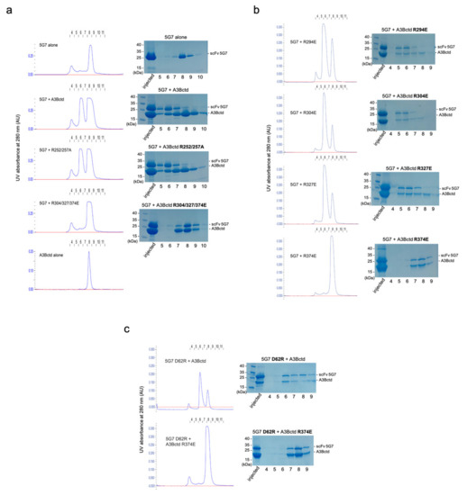 A3Bctd R374 is essential in 5G7-binding. (a) Complex formation by A3Bctd variants with substitutions of multiple Arg residues. The chromatograms are shown on the left, and SDS-PAGE analyses of the collected fractions are shown on the right. (b) Complex formation by A3Bctd variants with individual Arg substitutions. The results show that A3Bctd Arg374 is required for the binding to 5G7 while other Arg residues are not. (c) Complex formation between 5G7 D62R and A3Bctd or A3Bctd-R374E, showing that Asp62 is not important in the binding of A3Bctd.