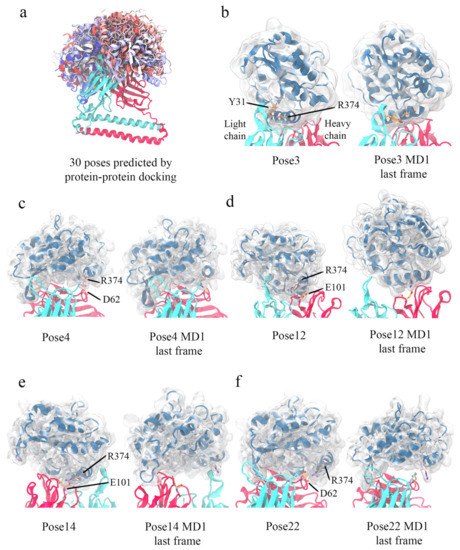 Given the availability of high-resolution crystal structures for both A3Bctd and 5G7 antibodies in their free forms and additional experimental restraints on the epitope from site-directed mutagenesis studies, we sought to further investigate possible binding modes by computational simulations. The total of 30 docking poses calculated by ClusPro showed a variety of relative orientations of the two proteins (Figure 7a). In five out of the 30 models, Arg374 of A3Bctd was positioned in the interface with 5G7 (Figure 7b–f). In light of the mutation analysis above, these were considered the most credible candidates. Thus, these five poses were further explored by 3-copy Gaussian-accelerated molecular dynamics (GAMD) simulations (1× 275ns + 2× 200ns), which is an enhanced sampling computational technique [27]. Interestingly, a set of slightly different binding poses (#4 and #22), both of which have A3B Arg374 interacting with 5G7 Asp62 at the C-terminal end of CDR H2, behaved differently in all three copies of MD simulations; pose #4 converged to a stable state, while pose #22 was not stable with A3B Arg374 moving away from 5G7 CDR loops (Figure 7c,f, Supplementary Figures S1–S5). In another pose (#12), MD simulations converged to a stable binding mode somewhat similar to pose #3 (Figure 7d and Supplementary Figures S1–S5). The remaining two poses (#3 and #14) have Arg374 of A3Bctd positioned more centered in the antigen-binding cleft between the heavy and light chains (Figure 7b,e). Pose #3 was stable during all three MD copies, whereas significant fluctuations of A3Bctd were observed for #14, particularly high in one of the three MD copies (MD1) (Supplementary Figures S1–S5).