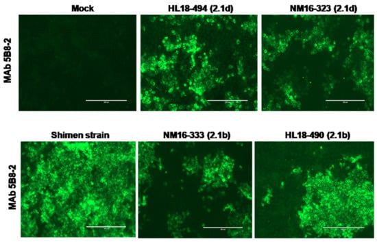 Confirmation of CSFV in PK-15 cells by IFA. The figure represented the reaction of anti-E2 MAb 5B8-2 with Shimen, NM16-323, NM16-333, HL18-494 and HL18-490 strains of CSFV. The scale bar is 200 μm.