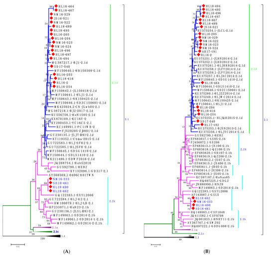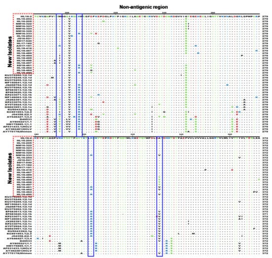 Erns protein contains three antigenic regions AR1, AR2 and AR3 [15,41]. Alignment results showed the four new isolates of subgenotype 2.1d (HL18-416, HL18-494, HL16-205 and NM16-323) contain mutations at positions 52 (T to I), and another four new isolates of subgenotype 2.1b (HL18-490, HL18-462, SD18-461 and NM16-333) contain mutations at positions 107 (D to N), 172 (G to D), 209 (S to R) and 210 (T to A) compared with previous reference isolates (Figure 5).