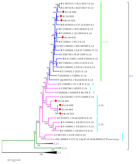 Phylogenetic tree based on the complete genome sequences of CSFV strains using the neighbor-joining (NJ) method, with 1000 bootstrap replicates. All new isolates were indicated by red diamonds, in which the subgenotype 2.1d isolates were indicated in pink while subgenotype 2.1b isolates were indicated in blue.