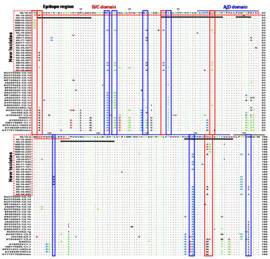 E2 is a highly immunogenic protein, and is a likely protein where mutations could occur that allow the new isolates to escape HCLV vaccination. The amino acid substitutions that were observed in our fully sequenced strains were mostly observed in antigenic regions either B/C or A/D. Alignment results showed that most of the new isolates together with our previously reported subgenotype 2.1d isolates contain variations at various positions 31 (K to R), 34 (N to S), 56 (T to I), 90 (S to A), 159 (K to R), 182 (L to W), 205 (R to K), 303 (R to K) and 331 (V to A), in which the mutation at positions 56 and 159 were located in neutralizing antigenic epitope regions (aa52-76 and aa155-176) corresponding to aa741-765 and 844-865 of the polyprotein, respectively (Figure 4). The four new isolates of subgenotype 2.1b (HL18-490, HL18-462, SD18-461 and NM16-333) contain mutation at positions 54 (K to R), 74 (L to S) and 165 (V to A) in neutralizing epitope regions (aa52-76 and aa155-176) and 47 (I to V). Some new isolates from Inner Mongolia (NM16-322, NM16-323, NM16-324 and NM16-329) contain mutations at positions 165 (V to E) and 166 (D to N) in neutralizing epitope region (aa155-176) corresponding to aa844-865 of the polyprotein. The new isolates (HL18-494, HL18-495, HL18-496 and HL18-497) showed mutation at positions 3 (S to F), 102 (L to N), 197 (M to I), 249 (S to G) and 331 (V to T).