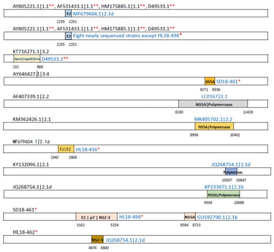 Schematic diagram showing the potential recombination events among different CSFV isolates. The genomic locations and breakpoints of the potential recombining segments are schematically indicated with colored frames. *, the new isolates in this study; **, C-strain vaccine.
