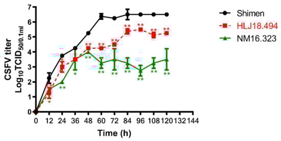 One-step growth curve analysis. Growth kinetics of the CSFV HL18-494, NM16-323 and Shimen strains was depicted by one-step growth curve. An MOI of 5 was used to infect PK-15 cells. The cell cultures were harvested at various time points and TCID50 was calculated. The mean values with standard deviations of three independent experiments were calculated. *, p < 0.05; **, p < 0.01, compared with the Shimen strain.