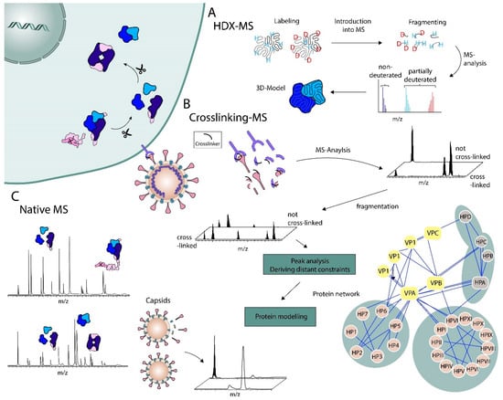 In conclusion, HDX and XL-MS/CL-MS are able to provide valuable structural data on proteins and protein assemblies. In the context of research on viruses, In Vivo XL-MS is especially valuable to elucidate host–pathogen associations and unknown involved proteins. Due to the fact that HDX is a gentler technique, it is particularly well-suited for the investigation of PTMs and the binding of ligands. For further reading, there are reviews that give a profound insight into the techniques and application of HDX [] and XL-MS [].