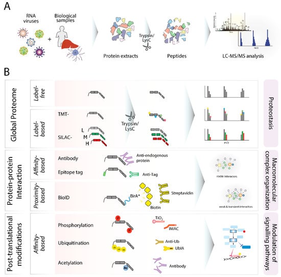 Two workflows have been traditionally established in MS-based proteomics: “bottom-up” and “top-down” proteomics. In bottom-up-based methods, proteins are proteolytically digested into peptides prior to their injection into the mass spectrometer, allowing an analysis of complex specimens from different biological material. Conversely, in top-down methods intact proteins are analyzed, making these workflows particularly suited for the analysis of different, co-existing post-translational modifications (PTMs) of a protein or protein complex [,]. Here we review current approaches, in particular proteomics-based datasets generated in the past 10 years that have been used to identify, profile, or characterize novel elusive aspects of RNA virus biology, including replication mechanisms and interaction with their hosts. Exemplary studies covering multiple RNA viruses and diverse proteomic workflows are covered, and the reader is referred to more specialized reviews.