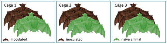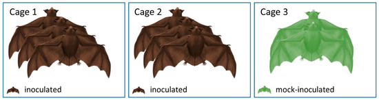 Experimental design of the experiment with A/bat/Egypt/381OP/2017 (H9N2). On 1 dpi, two inoculated and two naїve bats were mixed and housed in each of the three cages. This animal distribution was eventually maintained until the end of the experiment.