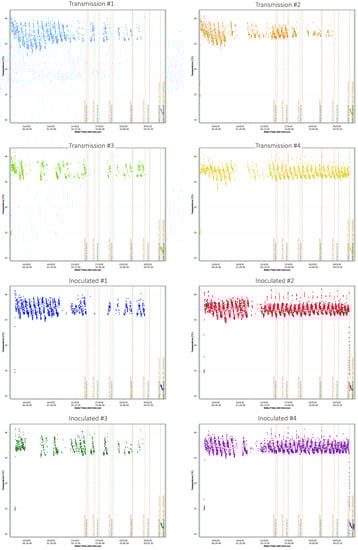 After infection with the H9N2 subtype of bat origin, none of the inoculated or contact animals showed any obvious clinical signs of an infection, such as anorexia, depression or signs of a respiratory infection. The temperature monitoring data did not reveal any obvious deviation from the physiological oscillation that ranges mainly between 34 and 41 °C (Figure 3), depending on the time of day and the animals’ activity. While only one of six contact animals (contact animal #4) displayed altogether two temperature maxima reaching 41 °C within 21 dpi, all six inoculated animals showed at least one maximum exceeding 40 °C, with two animals showing 11 temperature peaks > 40 °C (inoculated animal #2) or six peaks > 40 °C (inoculated animal #4) within the same time period. Inoculated animal #2 reached 41 °C twice during the experiment (Figure 3). Notably, contact animal #4 and inoculated animal #2 were kept in the same cage.
