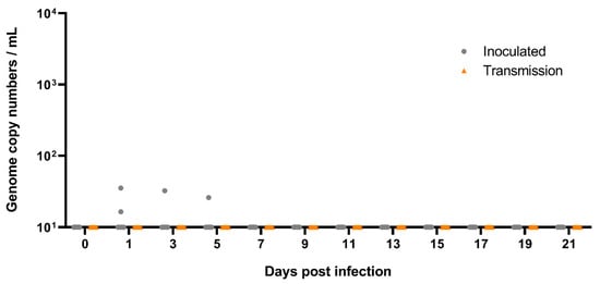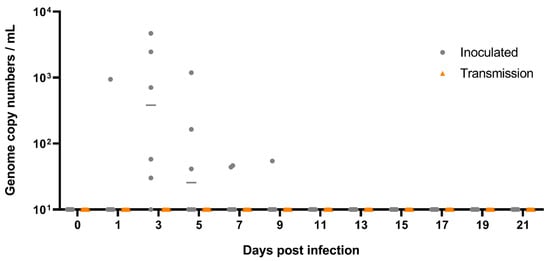 Inoculation of Egyptian fruit bats with 100 µL (dose 104.7 TCID50) per animal of A/bat/Egypt/381OP/2017 (H9N2) established a productive infection in these animals. At 1 dpi, one out of six oral swabs, as well as two rectal swabs from the inoculated animals, were positive for the H9N2 bat flu viral genome using RT-qPCR (Figure 4 and Figure 5). At 3 dpi, oral swabs of five out of six inoculated animals, and one rectal swab (inoculated animal #10), were positive for viral genome, ranging from 30 up to 4.6 × 103 viral genome copy numbers per mL (Figure 4 and Figure 5). Three oral swabs and one rectal swab of the inoculated animals after 5 dpi and two oral swabs from inoculated animals after 7 dpi, as well as one oral swab of an inoculated animal after 9 dpi were still positive for A/bat/Egypt/381OP/2017 (H9N2) genome. From 11 dpi until the end of the experiment at 21 dpi, all oral and rectal swabs were negative for H9N2 bat flu RNA (Figure 4 and Figure 5).