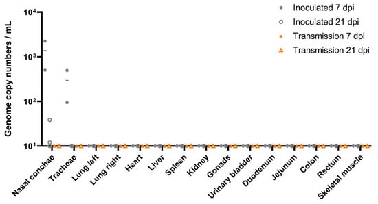 Viral loads in organs of A/bat/Egypt/381OP/2017 (H9N2)-inoculated Egyptian fruit bats. Individual results of detected viral RNA are depicted. Organs from two inoculated (filled grey dots) and two contact animals (filled orange triangles) were taken at 7 dpi, while organs from the residual four inoculated (open grey dots) and contact animals (open orange triangles) were taken after euthanasia at 21 dpi. Samples below 10 viral genome copy numbers per mL (equivalent to Ct 39.2) were considered negative.