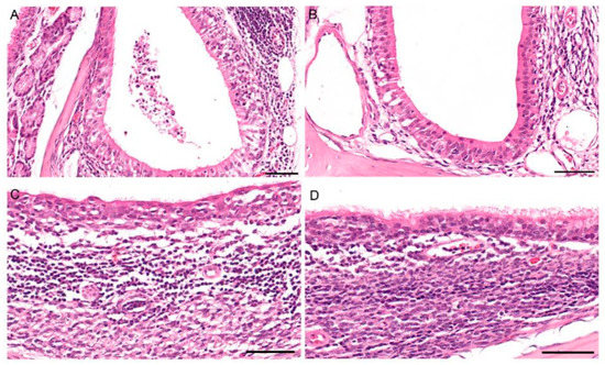 Histopathology in the nasal mucosa of fruit bats after infection with bat-origin H9N2 (A/bat/Egypt/381OP/2017), 7 dpi. (A) Inoculated animal #5: moderate transmigration of granulocytes and lymphocytes as well as intraluminal cellular debris within the nasolacrimal duct. (B) Unaffected nasolacrimal duct for comparison. (C) Contact animal #6: loss of cilia and moderate degeneration of the mucosal epithelium of the nasal-associated lymphoid tissue (NALT). (D) Unaffected NALT for comparison. All bars = 50 µm.
