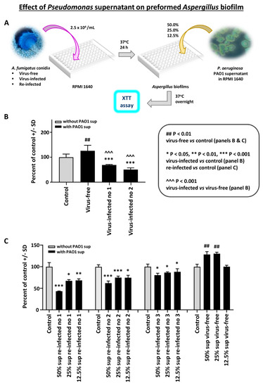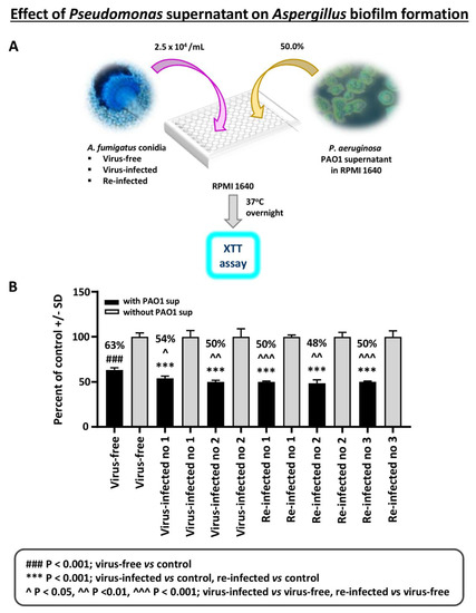 Effect of Pseudomonas planktonic supernatant on preformed Aspergillus biofilm: In the first study with preformed Aspergillus biofilm (i.e., after 16 h, till 40 h culture), and P. aeruginosa PAO1 planktonic supernatants, we found the virus-free preformed biofilm resistant to Pseudomonas supernatant (Figure 1B). In contrast, the two infected strains were significantly inhibited.