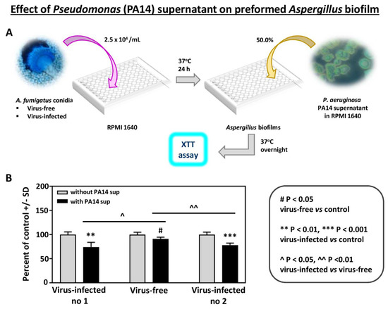 Effect of Pseudomonas (PA14) planktonic supernatant on preformed Aspergillus biofilm. (A). Diagram of methods. (B). All 3 Aspergillus strains are inhibited (XTT assay) at a 1:2 dilution of Pseudomonas supernatant (black bars), comparing to their own controls (medium alone)). The virus-free Aspergillus is less inhibited compared to the infected isolates, compared to 10-53 (left), and to 18-95 (right).