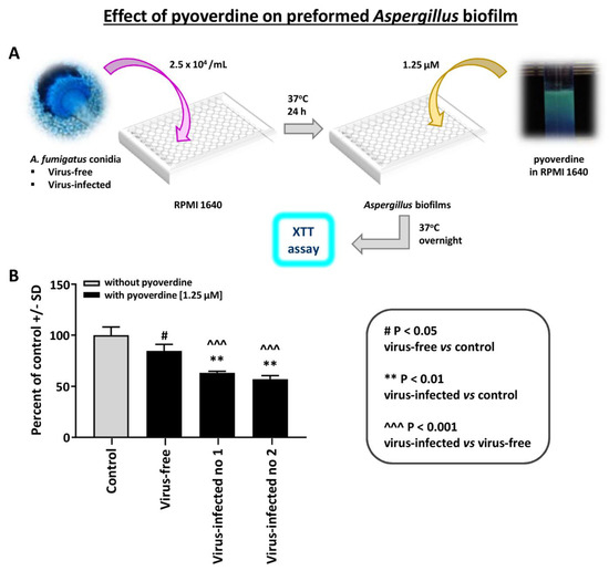 Effect of pyoverdine on Aspergillus strains. This figure compares the effect of pyoverdine, 1.25 micromolar, on preformed Aspergillus biofilm (XTT assay). (A). Diagram of methods. (B). The virus-free Aspergillus (black bar, second bar from left) is significantly less inhibited. “Infected nos. 1 and 2” are the two infected strains, 18-95 and 10-53, respectively.