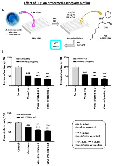 Effect of Pseudomonas Quinolone Signal (PQS) on preformed Aspergillus biofilm. This figure shows a dose-titration of 100, 10, and 1 mcg/mL PQS on preformed Aspergillus biofilm metabolism. (A). Diagram of methods. (B). At every concentration, the 2 virus-infected strains (“Infected nos. 1 and 2” are 18-95 and 10-53, respectively) are significantly more inhibited than the virus-free, which is the black bar, second bar from the left, of each segment. Control, RPMI 1640 medium with ethanol concentrations equivalent to that in PQS test reagent.