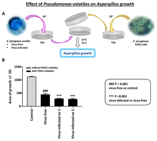 Effect of Pseudomonas volatiles on Aspergillus strains. An Aspergillus isolate was inoculated on trypticase soy agar (TSA) agar and sealed together with an inverted plate with Pseudomonas PAO1 growing on it; there was no direct contact between the plates. There were 4 plates prepared for each Aspergillus–Pseudomonas combination; means and SD are shown. The control is the same 2-plate apparatus, with no Pseudomonas on the inverted plate; two plates/Aspergillus isolate. (A). Diagram of methods. (B). The 3 Aspergillus isolates’ growth in the absence of Pseudomonas were not different (colony area) on TSA; thus, these growth results are merged and shown as “Control”. After ≥3 days of incubation, the virus-free Aspergillus (left black bar) was inhibited significantly less than the infected (“Infected nos. 1 and 2” are 10-53 and 18-95, respectively). The areas of growth here were measured after 72 h of co-exposure; prior to that, there were no statistically significant differences, as all the Aspergillus colonies continued to slowly enlarge over time.