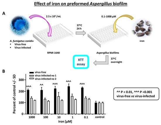 Effect of iron on Aspergillus strains. Differential effect of FeCl3 on virus-free compared to virus-infected Aspergillus preformed biofilm, XTT assay, over a range of iron concentrations. (A). Diagram of methods. (B). The 3 bars at the right are the control in RPMI1640 without added iron. Within each triplet, from left to right, are the virus-free Aspergillus (the black bars), and flanking the black bar each time, the infected Aspergillus strains (“infected nos. 1 and 2” are 10-53 and 18-95, respectively). Iron stimulates the virus-free strain to a significantly greater extent, at all iron concentrations.