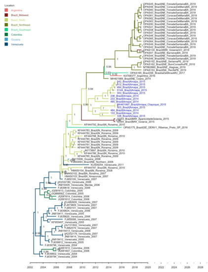 To expand our results, we used envelope-gene (n = 88), including more sequences, to estimate the regional phylodynamics of DENV-1 in northern Brazil. This envelope-based tree indicated that DENV-1 BR4 was introduced from Venezuela into Roraima and Amazonas states (northern Brazil) (probability = 1.0) (Figure 2). This same analysis suggested that the ancestor geographic location of Amapá sequences was from northern Brazil (probability = 0.94). In addition, one envelope sequence (MH401997) identified from the city of Oiapoque in 2015, a municipality in the state of Amapá on the border with Guyana, grouped in the same clade as our sequences, reinforcing that the BR4 lineage was prevalent in the state in this period and disseminated locally. Later, strains of the lineage BR4 spread to other regions of Brazil, such as the Northeast, Midwest, and Southeast, being detected until the present time [31].