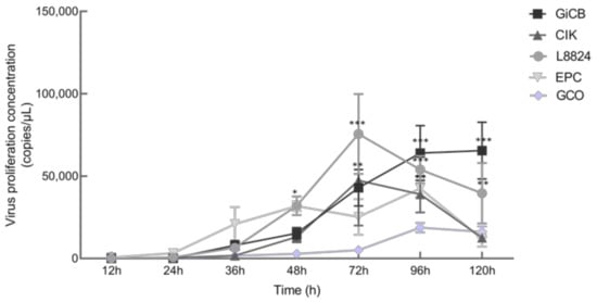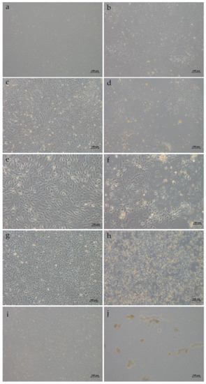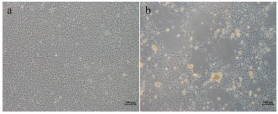 - Li, X.; Zeng, W.W.; Wang, Q.; Wang, Y.Y.; Li, Y.Y.; Song, X.J.; Huang, Q.W.; Shi, C.B.; Wu, S.Q. The study on the proliferation of GCRV Ⅱ in different fish cell lines. J. Fish. China 2016, 40, 1249–1257. [Google Scholar]