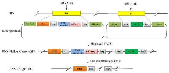 Schematic diagram of the recombinant pseudorabies virus (PRV) development strategy. The PRV virulence-related genes TK and gE were simultaneously replaced via the CRISPR/Cas9 system by using DNA templates that included fluorescent marker genes (mCherry and eGFP) and the Flt3L gene. Then, single cell fluorescence-activated cell sorting (FACS) was used to accelerate the screening and purification of the recombinant PRV virus. Subsequently, both fluorescent marker genes were excised using the Cre/Lox system.