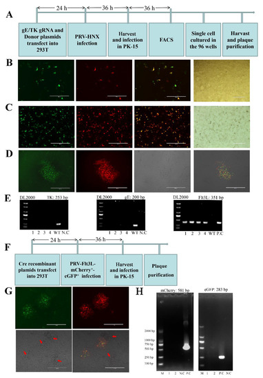 Virus-infected PK-15 cells were maintained in DMEM with 2% FBS for 24 h. After three rounds of freeze–thaw, the cell lysate was centrifuged for 10 min at 5000× g. The supernatant was used for next propagation or stored at −80 °C. For virus purification, the PK-15 cells were grown to approximately 80% confluence, then infected with recombinant virus, and covered with mixture of 2 × DMEM (Gibco, Thermo Fisher Scientific), 2% low melting-point agarose (HyClone, GE Healthcare Life Sciences, Inc., Stockholm, Sweden), 1% FBS (Natocor), 100 units/mL penicillin (Genom, Hangzhou, China), and 100 µg/mL streptomycin (Genom). The plaques were observed via fluorescence microscopy. After 36–48 h, well-separated plaques were picked up by a 10 µL pipette tip and transferred into micro-tubes containing 300 μL serum free DMEM for the next propagation or plaque purification.