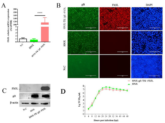 Characterization of the recombinant HNX-TK−/gE−-Flt3L. (A) Detection of the transcription of the Flt3L gene in HNX-TK−/gE−-Flt3L virus- and HNX-infected cells through RT-qPCR (**** < 0.001). (B) Detection of the Flt3L protein and viral gB protein expression through an immunofluorescence assay (IFA). Green: gB-positive cells; red: Flt3L-positive cells; blue: DAPI-stained PK-15 cell nucleus. DAPI, 4’,6-diamidino-2-phenylindole. (C) Western blot analysis of β-actin, gD, and Flt3L of the PK-15 cells infected with HNX-TK−/gE−-Flt3L, HNX, or DMEM as a control. (D) One step growth curves of HNX-TK−/gE−-Flt3L and HNX in PK-15 cells.