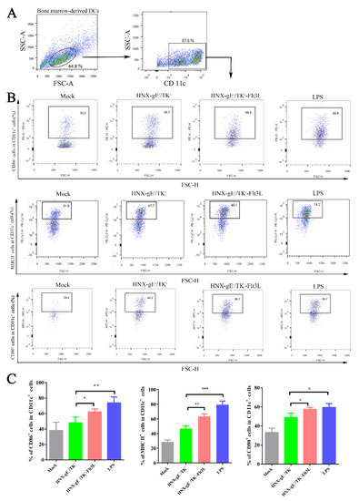 To assess the activation of bone marrow-derived DCs, DCs were cultured in 12-well plates and infected with HNX-TK−/gE−-Flt3L or HNX-TK−/gE− at 0.01 MOI. Lipopolysaccharide (LPS) was used as a positive control. After 24 h, DCs were harvested for flow cytometry analysis. To examine the activation of DCs in vivo, three-week-old female BALB/c mice were divided into three groups (ten mice each). Groups of BALB/c mice (n = 10) were stimulated with 1 × 105 TCID50 of HNX- TK−/gE−-Flt3L, HNX- TK−/gE−, or DMEM medium. Inguinal lymph nodes were collected from the mice at 36 and 72 h post infection (hpi). 5 mice were euthanized and inguinal lymph nodes were separated at each timepoint.