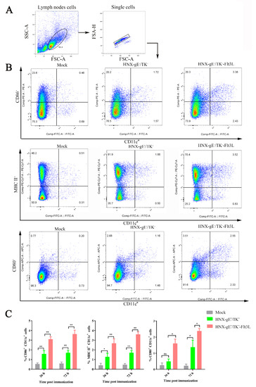 DC activation in mice immunized with HNX-TK−/gE−-Flt3L. BALB/c mice were immunized with 1 × 105 TCID50 of HNX-TK−/gE−-Flt3L, HNX, or DMEM. The inguinal lymph nodes were collected at 36 and 72 hpi. Single cell suspensions prepared from the inguinal lymph nodes were analyzed for the presence of DCs. (A) Representative gating strategy for DCs. (B) Representative flow cytometric plots of activated DCs (CD11c+ CD86+ cells, CD11c+ MHCII+ cells, and CD11c+ CD80+ cells). (C) Percentages of activated DCs (CD11c+ CD86+ cells, CD11c+ MHCII+ cells, and CD11c+ CD80+ cells) are summarized statistically in the chart. The data are the means from three independent experiments (* p < 0.05; ** p < 0.01).