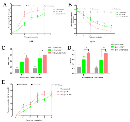 We further analyzed the immune responses elicited by HNX-TK−/gE−-Flt3L and HNX-TK−/gE−. First, a serum neutralization assay was performed to analyze the PRV antibody levels for different immunized groups. In the non-vaccinated group, no neutralizing antibody effective against PRV HNX strain infection was detected throughout the experiment. PRV-specific neutralizing antibodies of the HNX-TK−/gE−-Flt3L-vaccinated group and HNX-TK−/gE−-vaccinated group were detected at three-weeks post immunization and up to 5 weeks. At 5-weeks post vaccination, the neutralizing antibody titers of the HNX-TK−/gE−-Flt3L group (25.63) were remarkably higher compared with the HNX-TK−/gE− group (24.60) (Figure 6A). Secondly, blocking ELISA analysis of serum samples was performed to examine PRV gB-specific antibody levels. A significantly stronger antibody response was found in HNX-TK−/gE−-Flt3L vaccinated group compared with in the HNX-TK−/gE−-vaccinated group at two weeks post-vaccination (Figure 6B). The gB-specific IgG antibodies isotypes (IgG1 and IgG2a) at 2 or 4 weeks post vaccination were further examined. As shown in Figure 6C,D, compared with the HNX-TK−/gE−-vaccinated group, the IgG1 and IgG2a levels were significantly elevated in HNX-TK−/gE−-Flt3L-vaccinated group. The concentrations of IFN-γ in the serum were tested using ELISA, and the results are shown in Figure 6E. As expected, the HNX-TK−/gE−-Flt3L-vaccinated group showed higher concentrations of IFN-γ, which might indicate a stronger immune response.