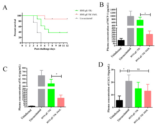 To further investigate the protective effects of HNX-TK−/gE−-Flt3L, after three weeks of booster immunization, the immunized mice were challenged at 1 × 105 TCID50 of wild type HNX strain by footpad injection. The survival and clinical symptoms of PR, e.g., pruritus, ruffled fur, and hyperkinesia, were observed for 2 weeks. In the HNX-TK−/gE−-Flt3L-vaccinated group, three mice showed clinical symptoms on day four post challenge. Two mice recovered over the following 2 days, and one mouse died (1/8). In the HNX-TK−/gE−-vaccinated group, seven mice showed clinical symptoms on day two post challenge, and five mice died (5/8). All mice in the control group died with severe pruritus (Figure 7A and Table 1). PRV infection induces a lethal systemic inflammatory response in mice [37]. Here, we performed ELISA assays to analyze the concentrations of inflammatory cytokines in the plasma three-days post challenge (Figure 7B–D). Compared to the non-vaccinated group, the lethal PRV infection induced much higher concentrations of IL-6, MCP-1, and CXCL10 in mice. In addition, compared to the HNX-TK−/gE−-vaccinated groups, HNX-TK−/gE−-Flt3L vaccination decreased the concentrations of IL-6 and MCP-1, but presented no significant changes in the level of CXCL10 at 72-h post challenge.