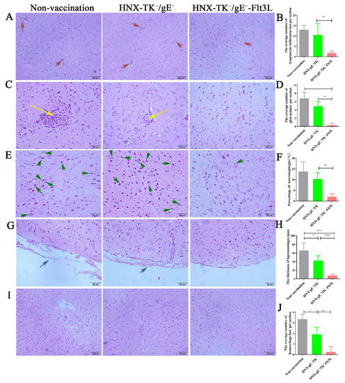 Histopathological examination of brains was performed at 72 h post challenge. Sections, containing cerebrum and cerebellum, were subjected to histopathological examination. The most significant microscopic observation in non-vaccinated and HNX-gE−/TK− -vaccinated group was mild nonsuppurative encephalitis in the cerebrum. In non-vaccinated and HNX-gE−/TK−-vaccinated group, we observed a slight lymphocytic infiltration of mononuclear and lymphocytes cells near blood vessels (Figure 8A,B), grey matter contained multifocal aggregates of glial cells (glial nodules) with affected neurons in center (Figure 8C,D), some affected neurons were surrounded by lymphocytes and glial cells (neuronophagia, Figure 8E,F). The leptomeninges expanded and contained small aggregates of lymphocytes, and increased clear space (edema, Figure 8G,H), and multifocal random accumulations of erythrocytes (hemorrhage, Figure 8I,J). The sections, obtained from HNX-gE−/TK−-Flt3L vaccinated group, had no significant alteration.