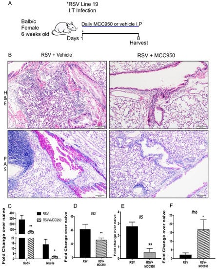 It has been described that RSV infection upregulates IL-1β through the activation of NLRP3-inflammasome [12,13,18]. To characterize the role of NLRP3-inflammasome inhibition, we infected adult BALB/c mice with RSV Line 19 and treated them daily with either an NLRP3 inhibitor (MCC950) or vehicle (0.5% EtOH) (Figure 1A). The histopathological findings reveal that inhibition of NLRP3-inflammasome during RSV infection using MCC950, a direct inhibitor of the NLRP3 protein [16], strongly reduced lung inflammatory infiltration and decreased mucus deposition in the airways, when compared with infected controls (Figure 1B). MCC950 treatment correspondingly decreased mucus-related gene expression Gob5 and Muc5ac (Figure 1C). Significantly decreased expression of mucus inducing Il13 (Figure 1D) and the Th2 cytokine Il5 (Figure 1E) with significant upregulation of antiviral Ifnb (Figure 1F) were also observed. No significant difference was observed in the expression of RSV fusion gene in the lung of the animals infected and treated when compared with infected controls (data not shown). These data suggest that NLRP3-inflammasome inhibition during RSV infection abrogates viral lung immunopathology and promotes innate antiviral responses by increasing type 1 interferon.