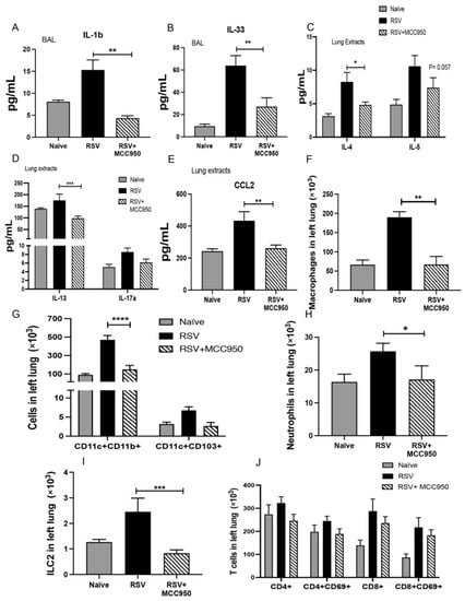 To characterize the role of NLRP3-inflammasome activation in the inflammatory immune response, we evaluated bronchoalveolar lavages (BAL) of adult mice infected with RSV under MCC950 treatment and control. First, we analyzed the production of IL-1β in the BAL of the adult mice and we observed that MCC950 treatment decreased levels of IL-1β in the sample when compared with control group (Figure 2A). Furthermore, NLRP3 inhibition diminished production of IL-33 in the BAL fluid compared with controls (Figure 2B). Levels of IL-4, IL-13 and CCL2, were significantly decreased in total lung protein extracts (Figure 2C,E), with no significant differences observed in IL-5 and IL-17 (Figure 2C,E). Total leukocyte numbers were analyzed to characterize the inflammatory response and we observed significantly reduced total numbers of interstitial macrophages, CD11c+CD11b+ antigen-presenting cells (APC), neutrophils and type 2 innate lymphoid cells (ILC2) in the MCC950 treated mice compared with control RSV infection (Figure 2F,I) with no difference in T cells (Figure 2J). These data suggest that NLRP3-inflammasome activity has an important role during RSV immune response, which leads to Th2 immune response and severe disease.