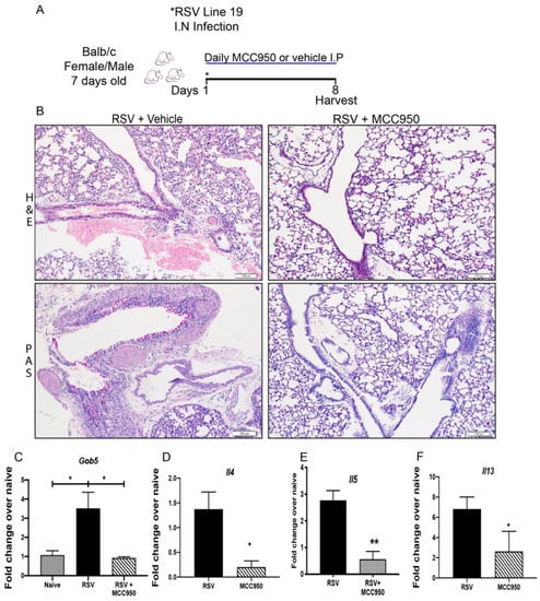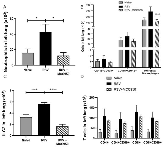The severity of RSV infection and immunopathology has been linked with different factors. For example, the age at which a child is infected, as preterm babies and infants are more susceptible to developing severe RSV disease [25]. To examine the role of NLRP3-inflammasome inhibition on RSV immunopathology, we intranasally infected neonate BALB/c mice at 7 days of age treated with MCC950 or vehicle (Figure 3A). Examination of histopathology determined that the MCC950 treatment reduced mucus production and goblet cell metaplasia compared with vehicle-treated controls (Figure 3B) as well as a correlative decrease in mucus gene expression of Gob5 (Figure 3C). Importantly, a reduction of Th2 cytokine gene expression of Il4, Il5 and Il13 was observed in MCC950-treated mice (Figure 3D–F). Examination of lung inflammation demonstrated decreased numbers of neutrophils, interstitial macrophages, ILC2 and CD8+ T cells in the RSV+MCC950-treated group compared with controls (Figure 4A,D). Thus, similar to adults, neonatal mice treated with MCC950 during RSV infection presented decreased RSV immunopathology, suggesting the NLRP3-inflammasome plays an important role in the RSV severity during early-life.
