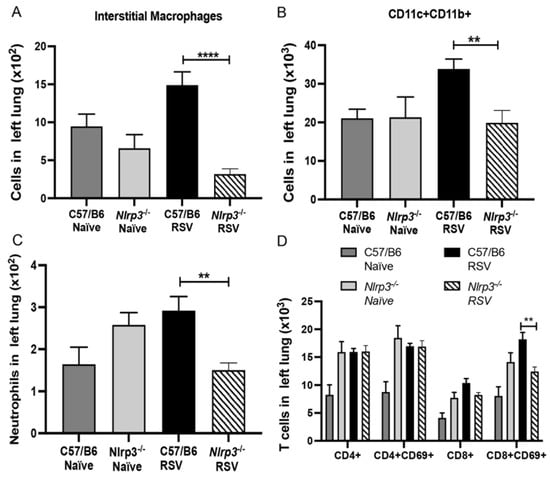 Diminished RSV airway inflammation in Nlrp3−/− neonate mice. (A) Neonatal Nlrp3−/− or C57BL/6 mice were infected with RSV. Flow cytometry of the lung leukocytes (A) Interstitial macrophages (B) CD11c+CD11b+ antigen-presenting cells (C) Neutrophils (D) T cells. Data represent the Mean ± SEM from 4 to 5 mice (experimental repeats 2). ** p ≤ 0.01, **** p ≤ 0.0001.