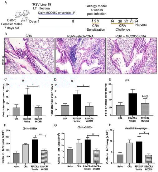Severe RSV infection is the most prominent cause of bronchiolitis and childhood hospitalization in infants under six months of age. This group of infants is the most susceptible to developing severe RSV disease and asthma later in life [1,2]. To evaluate whether the NLRP3-inflammasome during early-life impacts long term disease phenotypes, we used neonatal RSV infection followed by the cockroach allergic model (Figure 7A). Neonatal RSV infected mice treated with MCC950 or vehicle during the infection were sensitized and challenged with cockroach allergen (CRA) at 5 weeks of age. As controls, naïve and CRA only treated age-matched animals were used. Lung histology showed that inhibition of NLRP3 during early life RSV infection (RSV+MCC950/CRA) did not have an exacerbated allergic phenotype compared to the control treated neonatal RSV infected mice (RSV+vehicle/CRA) (Figure 7B). Lung cytokine gene expression of Il4 and ll-5 was significantly downregulated with a trend towards decreased Il13 in the RSV+MCC950/CRA compared with RSV+vehicle/CRA group (Figure 7C,E). Inflammatory infiltration in the lung was evaluated and we observed significantly decreased numbers of APC, including CD11c+CD11b+, CD11c+CD103+ and interstitial macrophages in the RSV+MCC950/CRA when compared with RSV+vehicle/CRA (Figure 7E,G). Altogether, these data indicate that NLRP3-inflammasome has a role during early-life RSV infection that alters the immune response to the secondary lung insult in the adult mice.