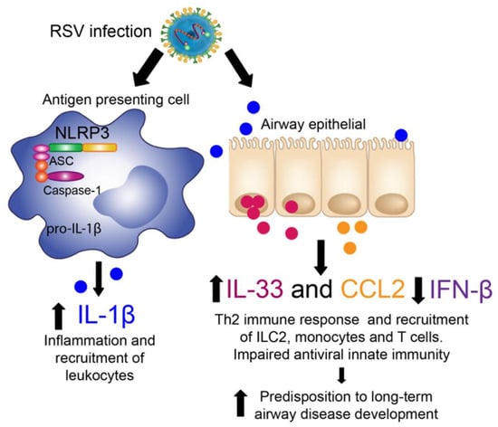 RSV induces NLRP3-inflammasome activation and leads to Th2 response. RSV infection activated NLRP3-inflammasome in Antigen presenting cells (APC), that trigger the production of IL-1β. Airway epithelial cells increases the expression of IL-33 and CCL2 when IL-1β is upregulated and downregulated IFNβ. IL-33 and CCL2 can recruit ILC2, monocytes, APC and T cells to the lung and increase the predisposition to airway disease development later in life.