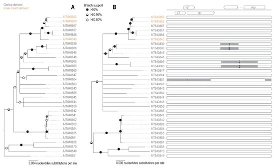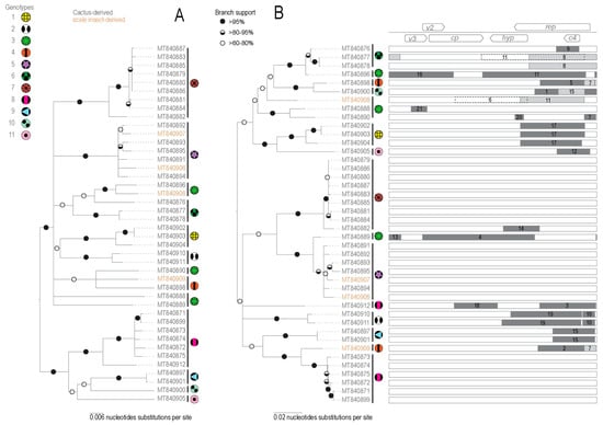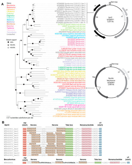 3.3.1. Diversity of Opuntia Becurtoviruses