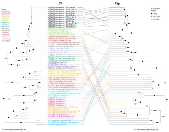 - Varsani, A.; Roumagnac, P.; Fuchs, M.; Navas-Castillo, J.; Moriones, E.; Idris, A.; Briddon, R.W.; Rivera-Bustamante, R.; Murilo Zerbini, F.; Martin, D.P. Capulavirus and Grablovirus: Two new genera in the family Geminiviridae. Arch. Virol. 2017, 162, 1819–1831. [Google Scholar] [CrossRef]