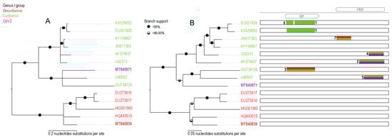 | 2~ | 2719–3418 * | ^AF379637 curtovirus | MT840871 OpV2 | AY134867 curtovirus | RGBMCS | 2.56 × 10−24 |