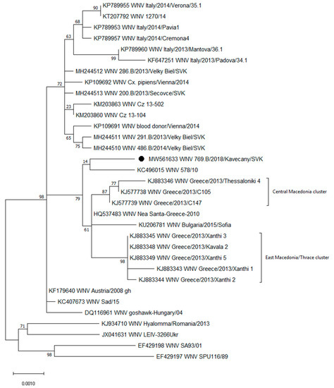 - Drzewniokova, P.; Barzon, L.; Franchin, E.; Lavezzo, E.; Bakonyi, T.; Pistl, J.; Csank, T. The complete genome sequence analysis of West Nile virus strains isolated in Slovakia (central Europe). Arch. Virol. 2019, 164, 273–277. [Google Scholar] [CrossRef]