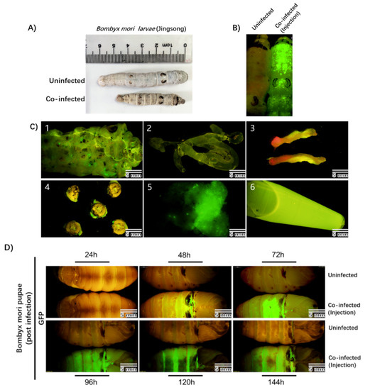 As previously described when the Bombyx mori larvae reached the fifth instar stage, they were injected with 5 uL (~1 × 106 VG) each of two the recombinant baculoviruses (or sterile PBS buffer as uninfected control) near the proleg (forward from the body cavity) [15]. For the observation of pathological symptoms after the injection, the larvae were narcotized on ice, and low-magnification imaging was carried out by stereomicroscope (Olympus SZX16, Shinjuku-ku, Tokyo, Japan) to obtain the whole-larvae fluorescence images. Infected larvae were washed three times with PBS buffer (pH 7.4, Gibco, Grand Island, NY, USA) to collect and stored at −80 °C.
