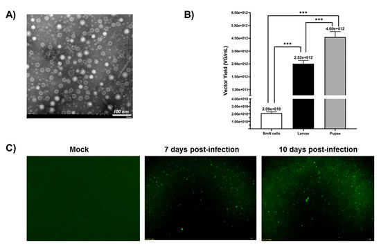 - Wu, Y.; Jiang, L.; Geng, H.; Yang, T.; Han, Z.; He, X.; Lin, K.; Xu, F. A Recombinant Baculovirus Efficiently Generates Recombinant Adeno-Associated Virus Vectors in Cultured Insect Cells and Larvae. Mol. Ther. Methods Clin. Dev. 2018, 10, 38–47. [Google Scholar] [CrossRef] [PubMed]