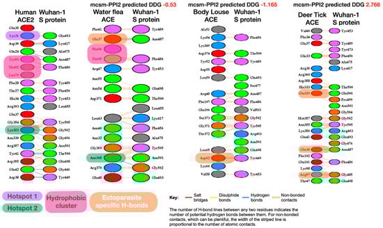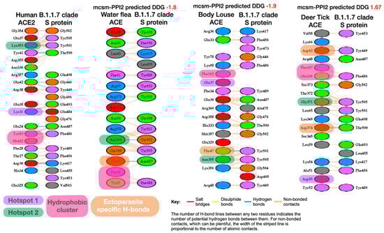 We used the LIGPLOT program of PDBsum [] to examine possible residue interactions between the Spike S protein and the ACE proteins, contrasting interactions in human proteins with those for the ectoparasite proteins. Several studies have highlighted the importance of key interaction sites between RBD of Spike S protein and ACE2, in particular, three sites on the interface: hydrophobic pocket, hotspot-353 and hotspot-31 []. These sites have previously been identified [] as key to understanding why the SARS-CoV-2 S-protein binds to human ACE2 with high affinity and how the viral S-protein has evolved to bind with much higher affinity to human ACE2 than SARS-CoV [,,].