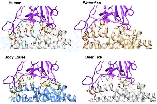 It can be seen from Figure 1 below that a number of hydrogen bonds have been lost in the ectoparasites, including some for these key interaction sites. However, for some of the ectoparasites (i.e., water flea, body louse and deer tick) there has been an increase in non-bonded contacts, and these are distributed across the whole interface.